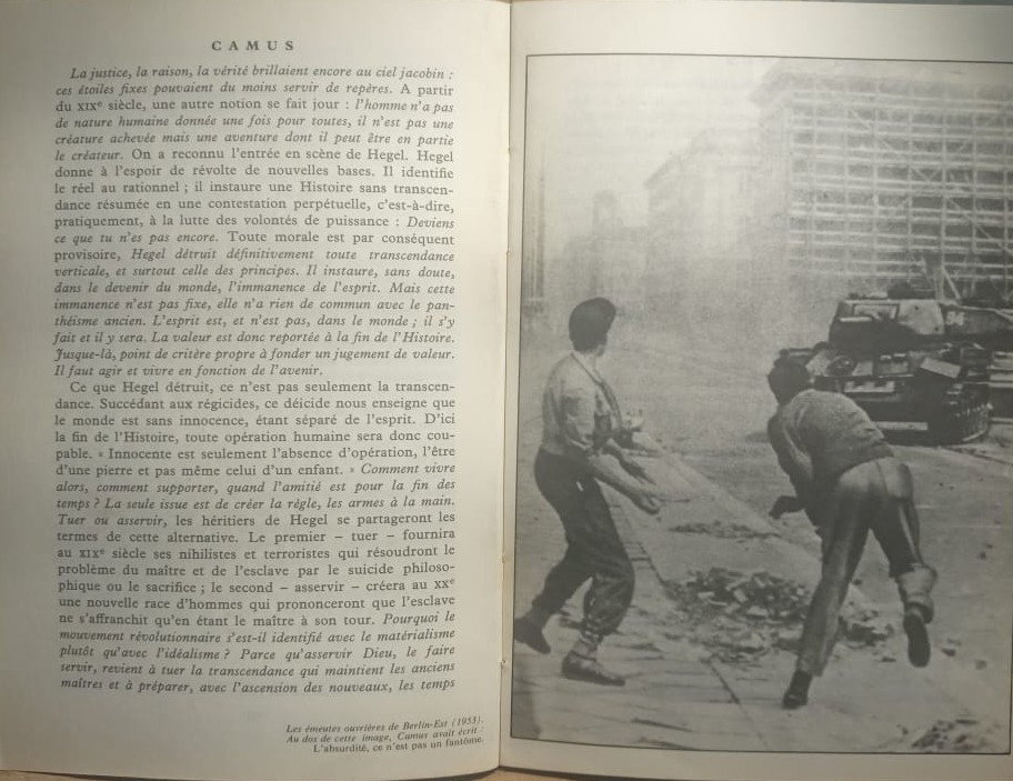 Lendo uma biografia de Albert Camus (Morvan Lebesque, Camus par lui-méme) , descubro que ele escreveu atrás de uma imagem onde dois jovens combatem com pedras um tanque de guerra esta frase: “L’absurdité, ce n’est pas um fantôme”